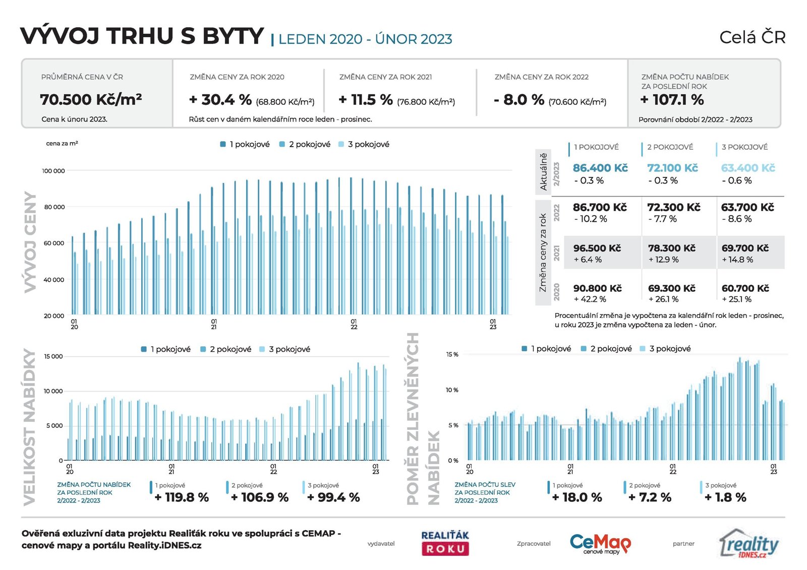 V posledních letech se realitní trh v ČR vyvíjí neobvykle. Ceny bytů strmě rostly v letech 2020 a 2021, ale od začátku roku 2022 se situace obrátila a ceny klesají. V průměru se cena bytů snížila o 8,4 % na 70 500 Kč/m2. Zvláště jednopokojové byty zaznamenaly největší propad, a to o 10,2 %, protože v minulých letech byly oblíbenou investiční komoditou. Toto je vývoj trhu, který málokdo zažil.