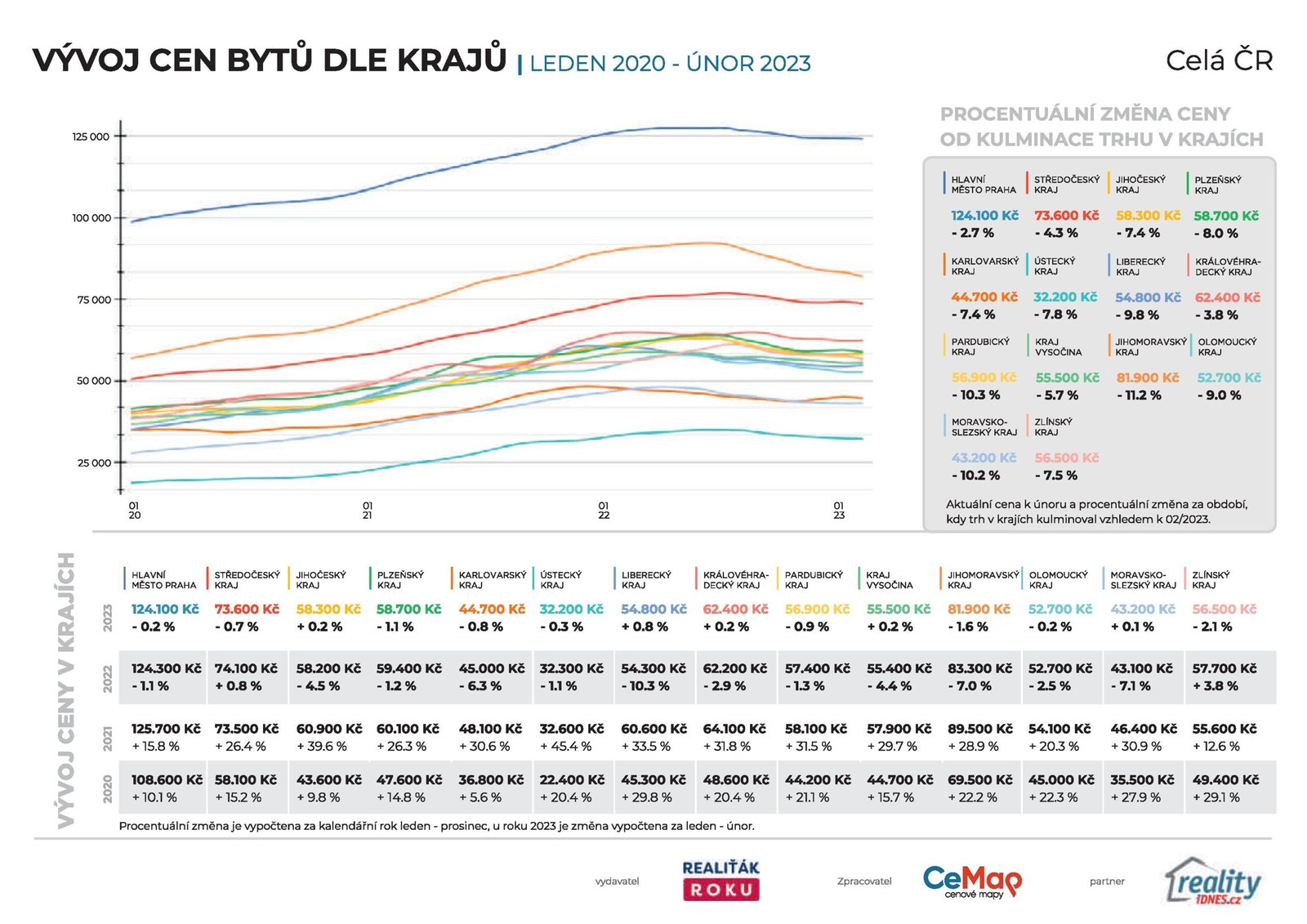 I když ceny bytů v ČR klesají, situace se zatím nedokáže vyrovnat s dramatickým nárůstem z let předchozích. Pokles je různý v jednotlivých krajích. Největší meziroční pokles cen bytů zaznamenal kraj Liberecký s 10,3 % a Moravskoslezský kraj s 7,1 %.